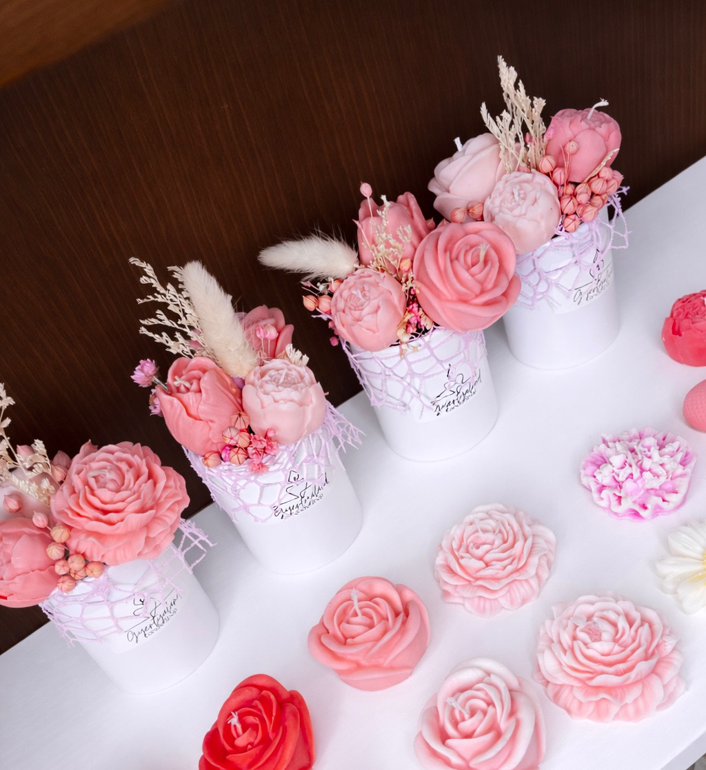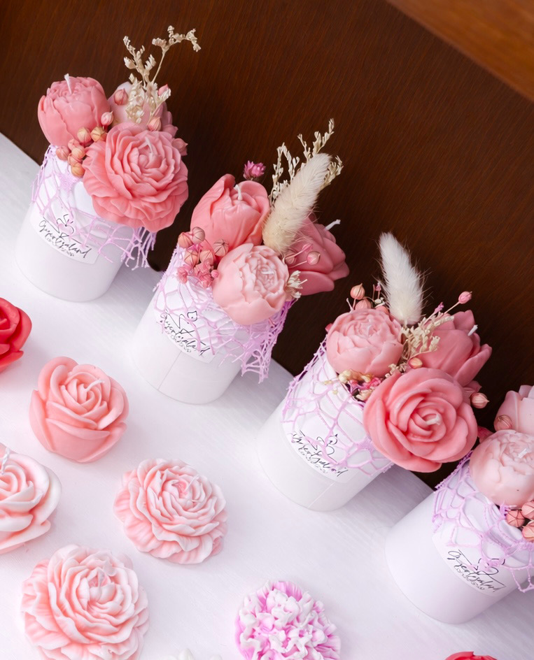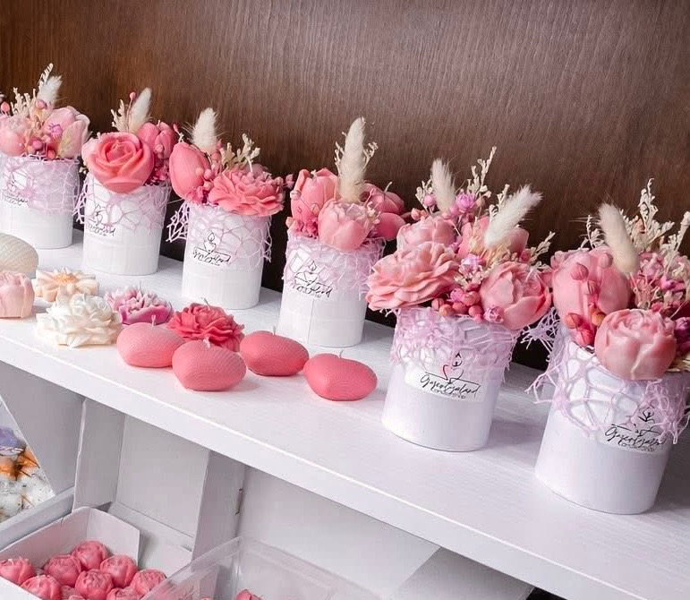 Ez a különleges, rózsaszín virágcsokor nemcsak gyertya, hanem egy elegáns dekoráció is. A részletgazdag rózsaszín virágkompozíció vidám hangulatot teremt, így tökéletes ajándék vagy otthoni dísz.