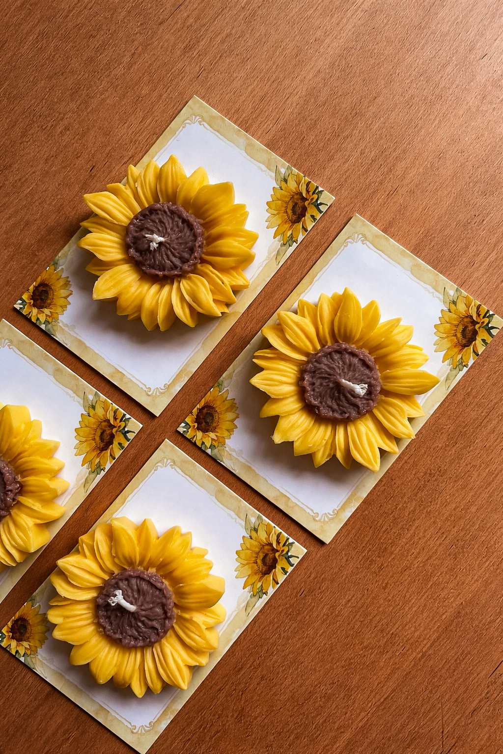 Különleges, kézzel készült napraforgó formájú gyertya, amely nemcsak dekoráció, hanem szívből jövő ajándék is.