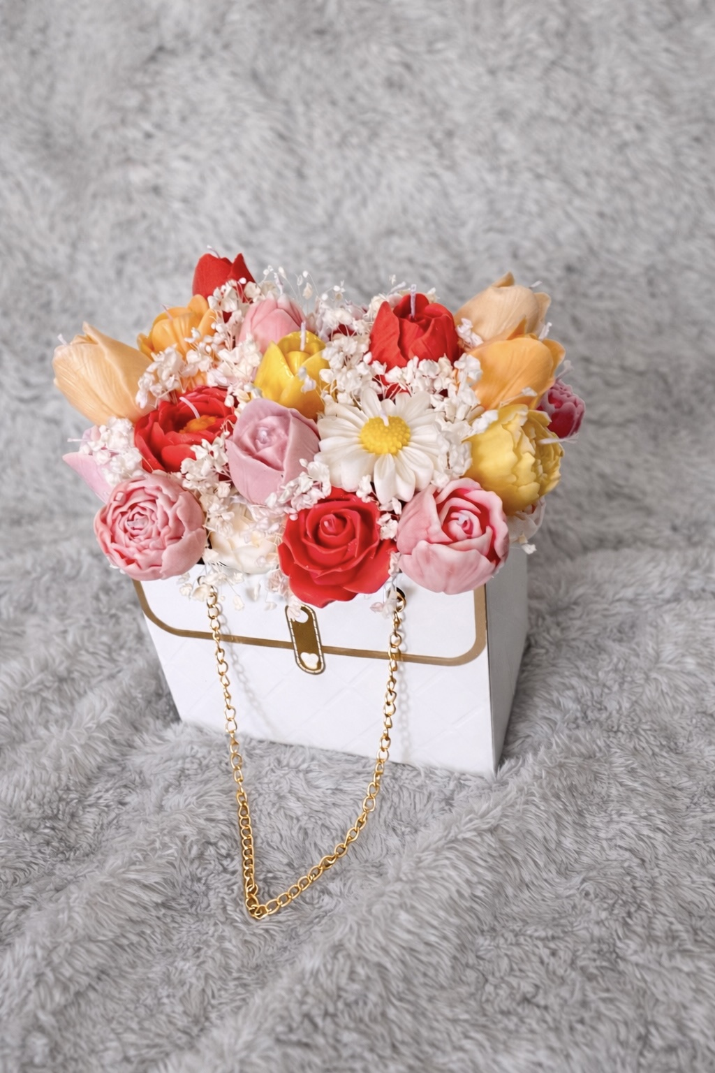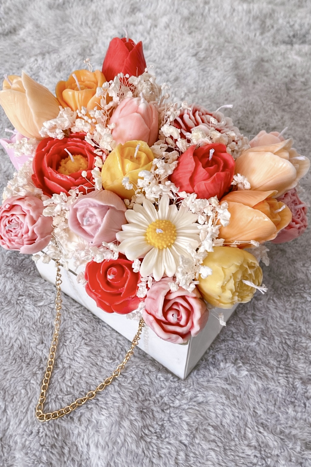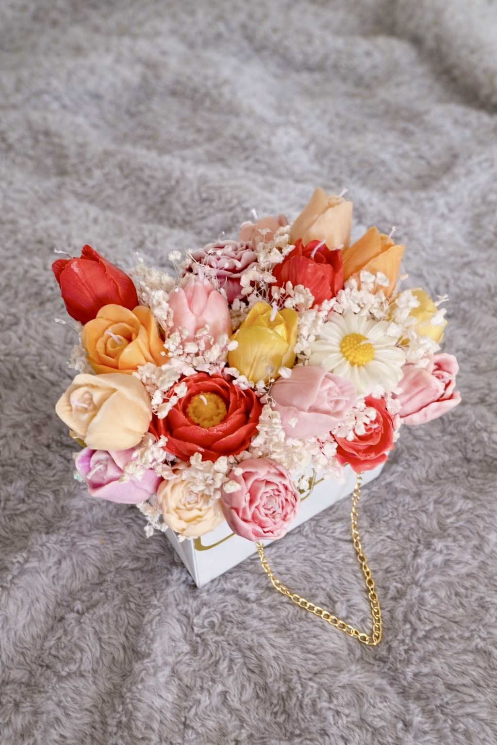 Különleges virágcsokor gyertya, amely kézzel készült vegán szójaviaszból tavaszi színekben.