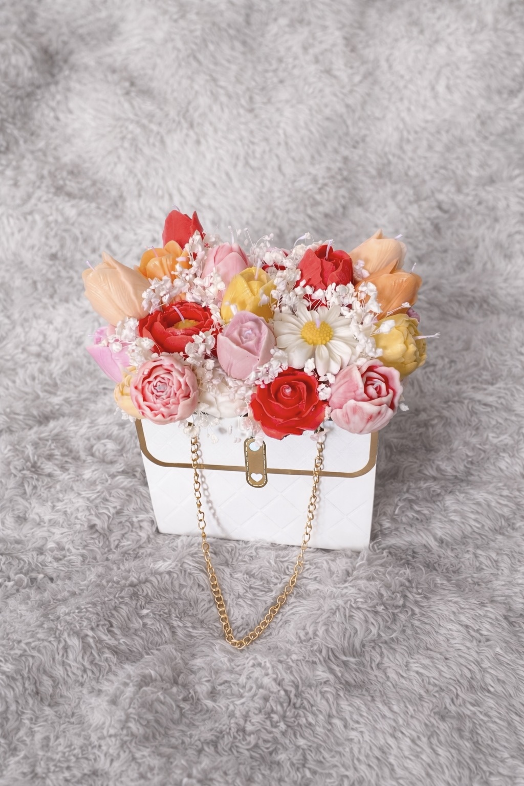Mivel minden darab kézzel készül, a táskák és a virágok elrendezése minimálisan eltérhet a fotón látottaktól. Két teljesen egyforma darabot nem lehet készíteni – ettől válik minden gyertya igazán egyedivé.