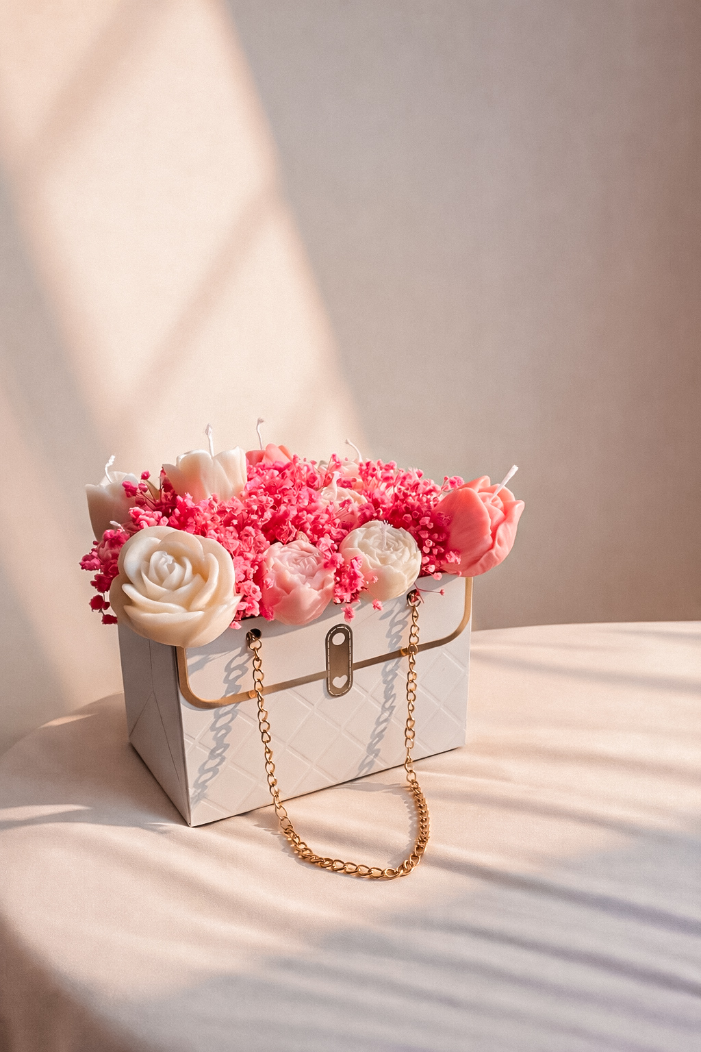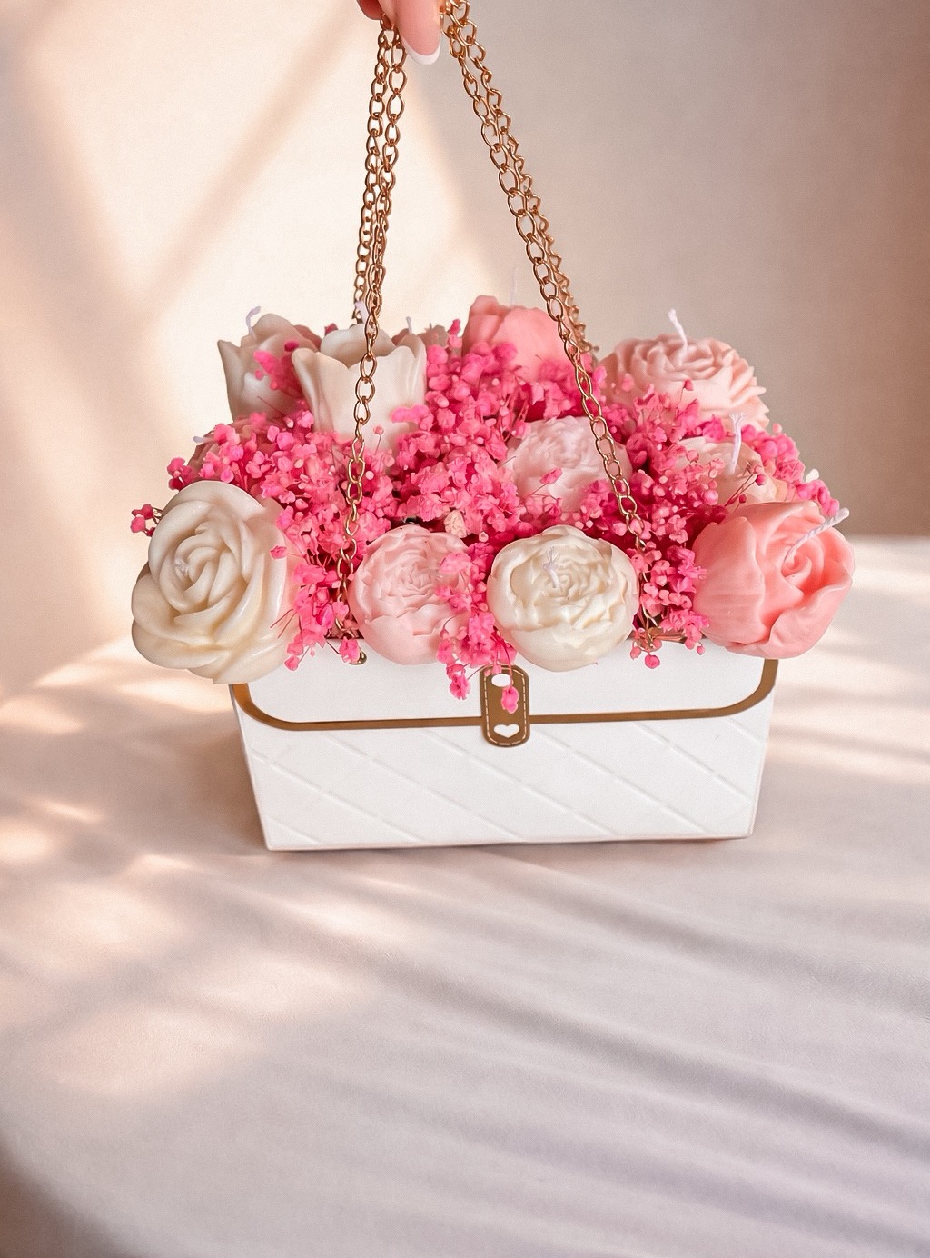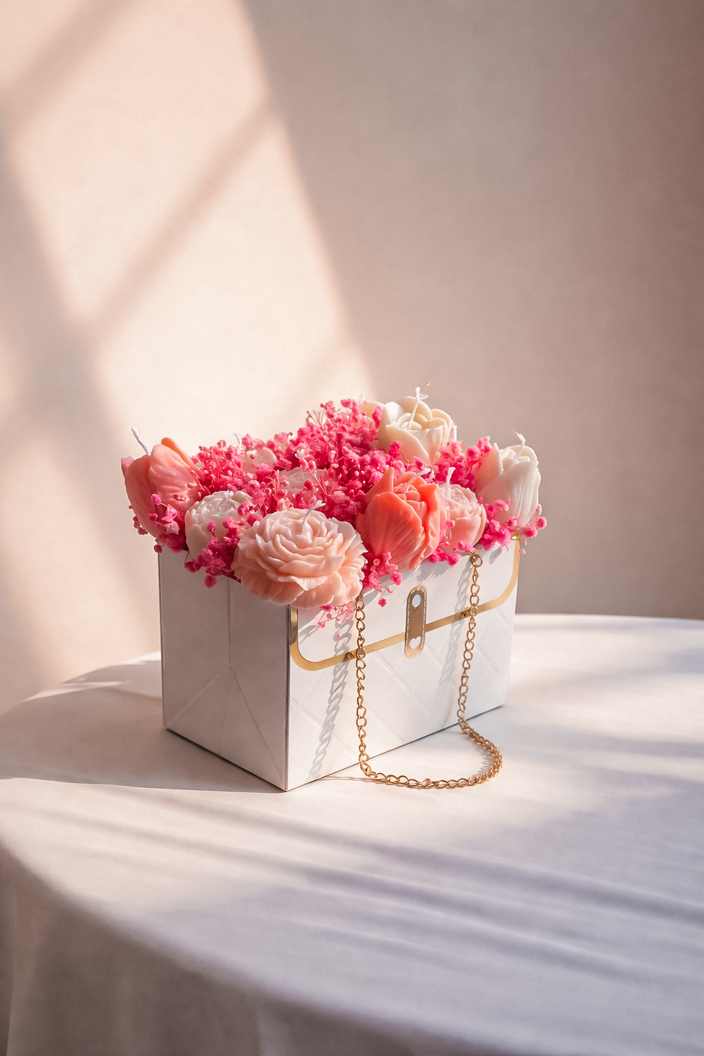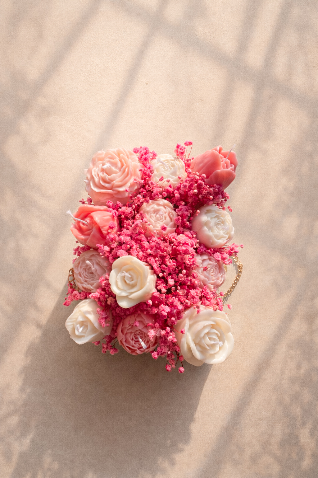 Különleges, kézzel készült virágcsokor gyertya vegán szójaviaszból, amely egyszerre dekoráció és illatos gyertya. A finom rózsaszín és fehér árnyalatok romantikus, tavaszi hangulatot teremtenek bármely otthonban.