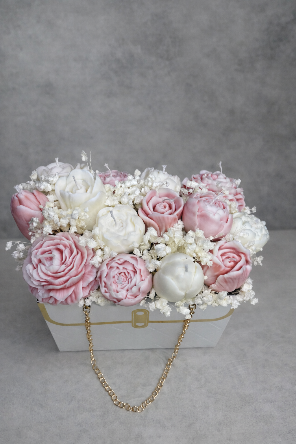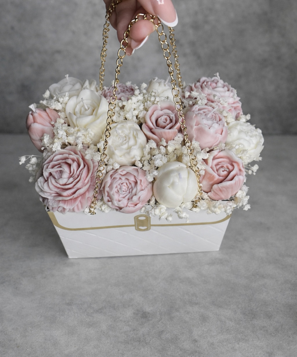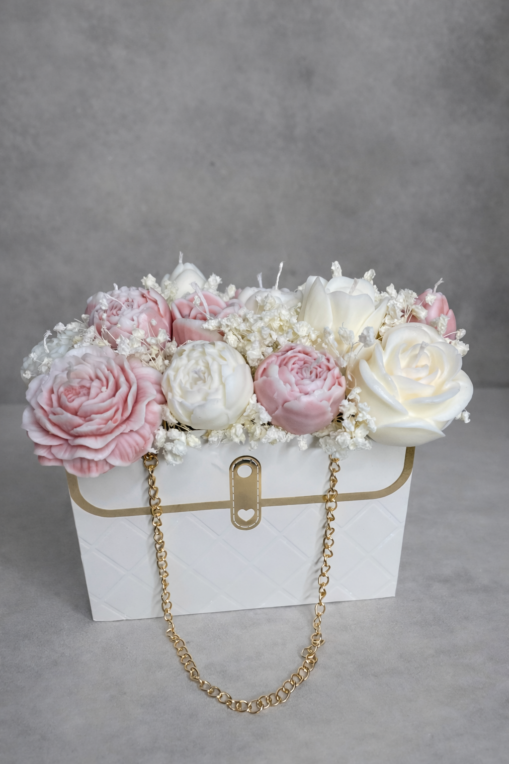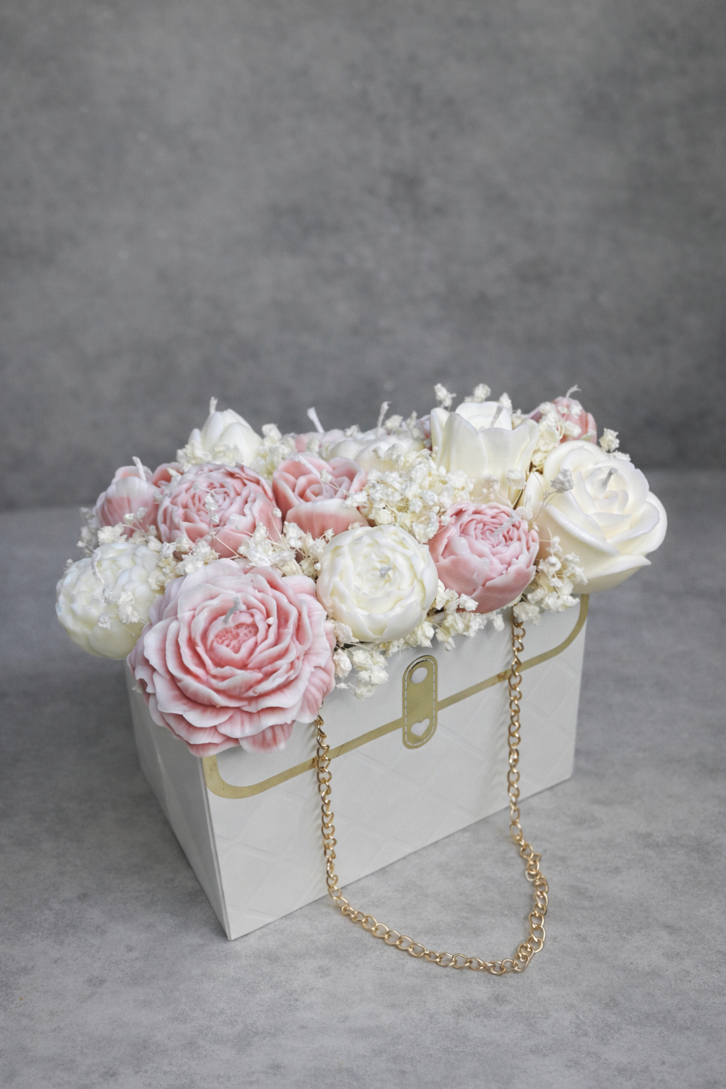 A fehér táska elegáns megjelenést ad a gyertya virágoknak, ezért ajándéknak is tökéletes választás születésnapra, évfordulóra, anyák napjára vagy bármilyen különleges alkalomra.✨