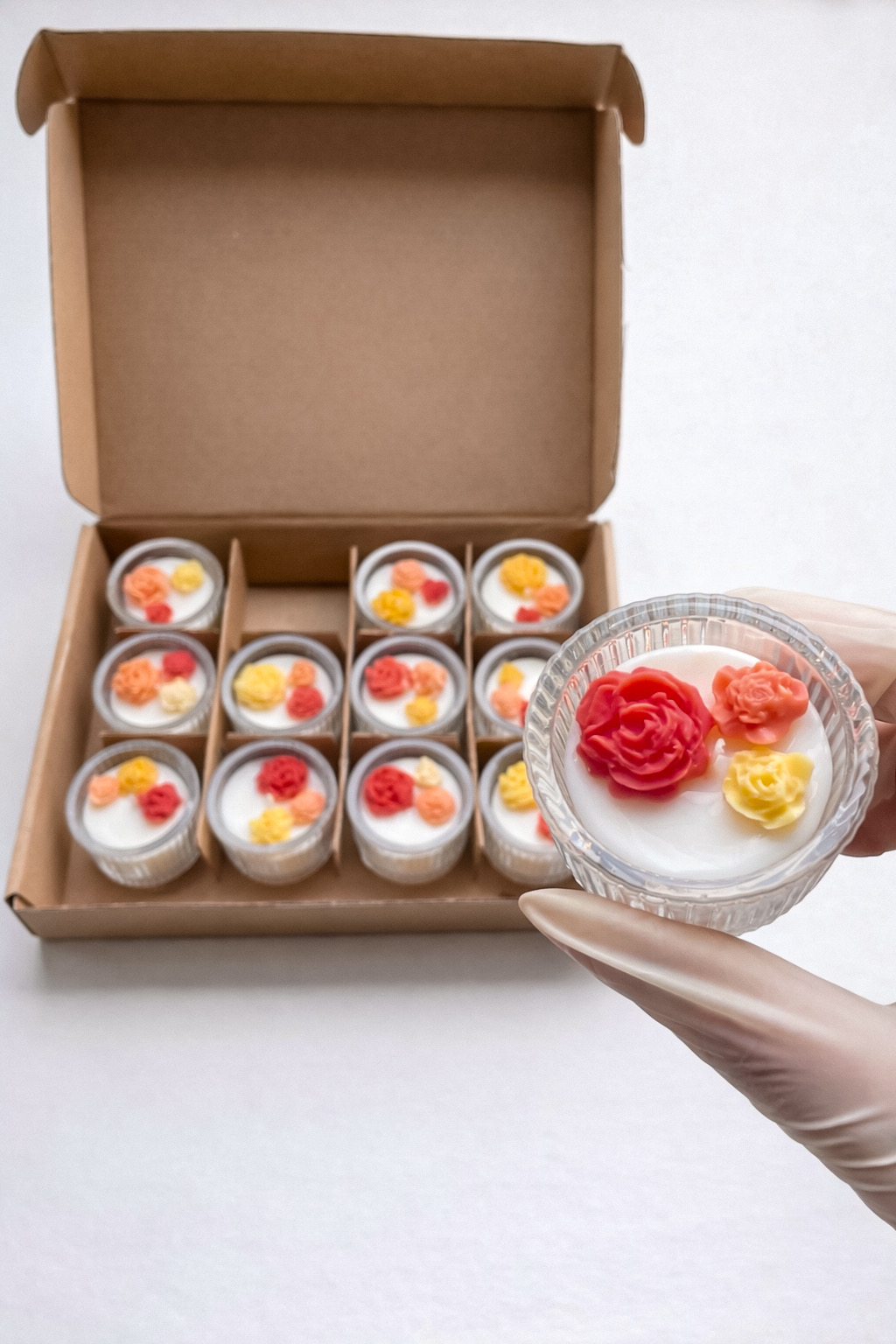 A gyertya természetes szójaviaszból készül, így vegán, környezetbarát választás. A tetejét aprólékosan kidolgozott, színes virágok díszítik, amelyek tavaszias hangulatot teremtenek.